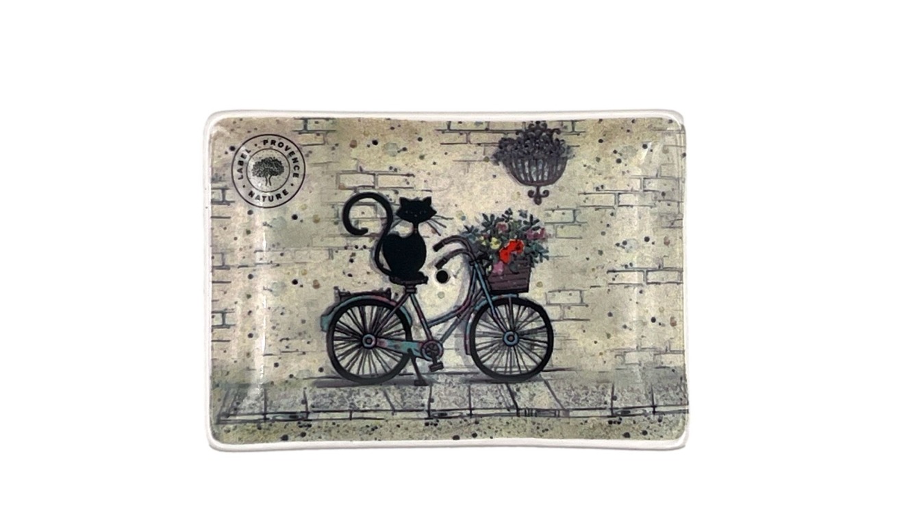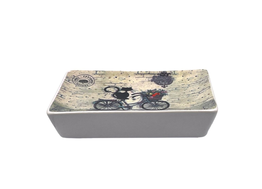 Dit keramieken zeepbakje is voorzien van een decoratieve print van een zwarte kat op een fiets, met als achtergrond een oude Franse muur. Het ontwerp is geïnspireerd op een traditioneel sfeerbeeld uit Zuid-Frankrijk. Door de stevige, platte vorm blijft het stabiel liggen en is het geschikt voor dagelijks gebruik in badkamer, keuken of toilet.