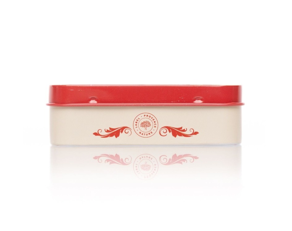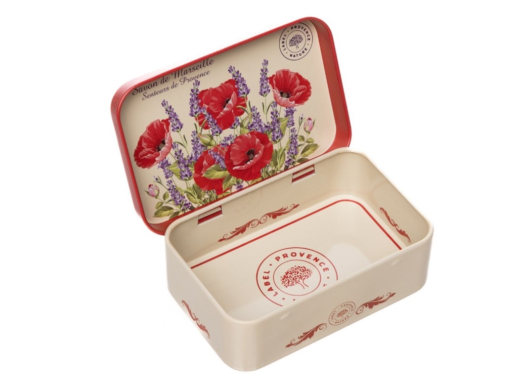 Handig voor op reis, een stuk zeep in te bewaren of als cadeau deze zeepblikken voor een stuk 125 gram Franse zeep! De klaproos en lavendel bloemen geven dit blikje een gezellige look.