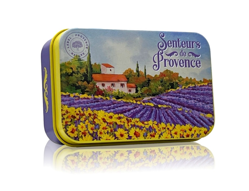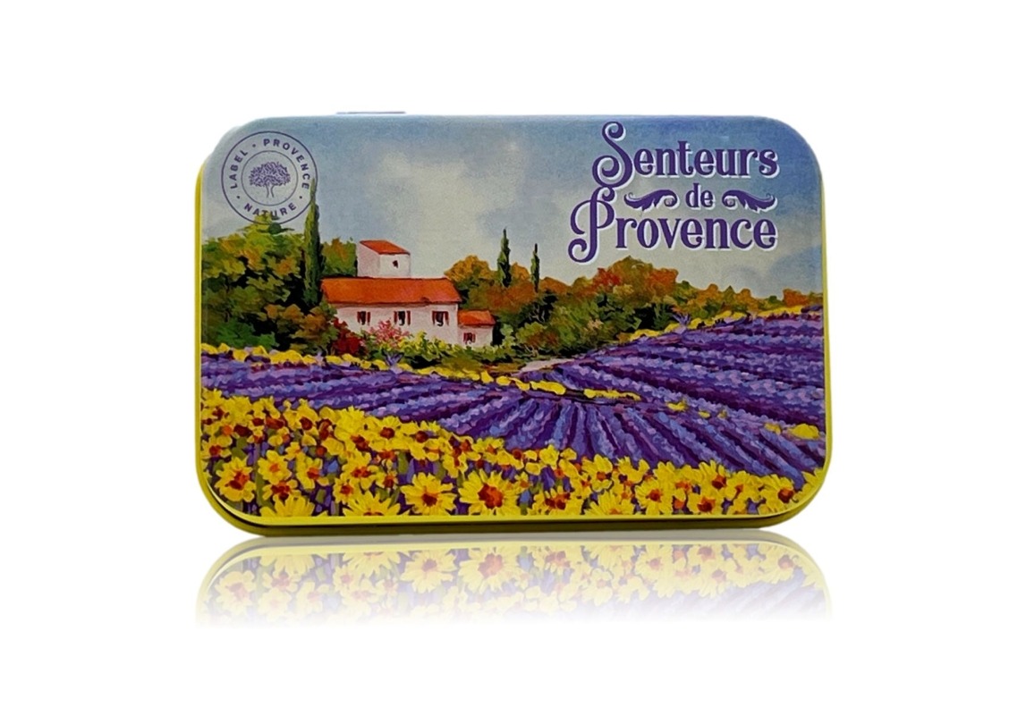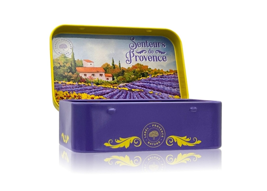 Fleurig en kleurig zeepblik, passend voor een stuk Franse zeep van 125 gram. Onwijs handig voor op reis, origineel om cadeau te geven of als blikvanger in huis.
