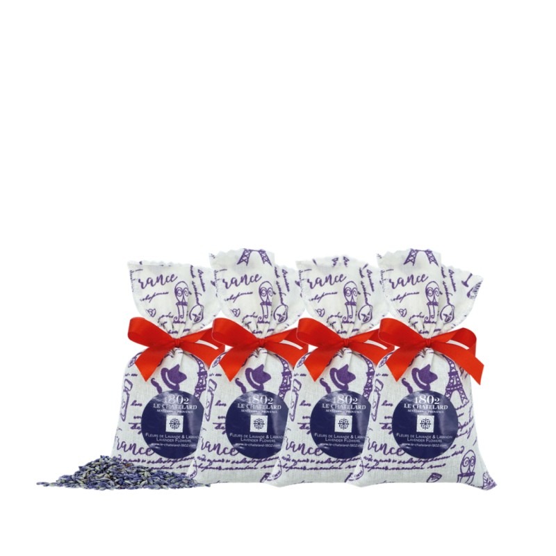 Breng de geur van de Provence in huis met deze set van 4 lavendel en lavandin geurbuideltjes van Le Chatelard 1802. Elk zakje is gevuld met zorgvuldig gedroogde bloemen die een heerlijke, rustgevende geur verspreiden. Perfect voor in je kledingkast, linnenkast of op een plank in de badkamer.