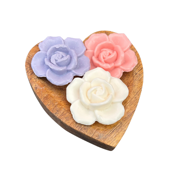 Deze drie handgemaakte bloemzepen liggen samen op een stijlvol houten hart. Een echte blikvanger in de badkamer of op de wastafel. De zepen zijn gemaakt van biologische olijfolie en verrijkt met verzorgende ingrediënten die de huid zacht reinigen en hydrateren.