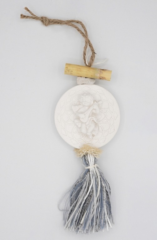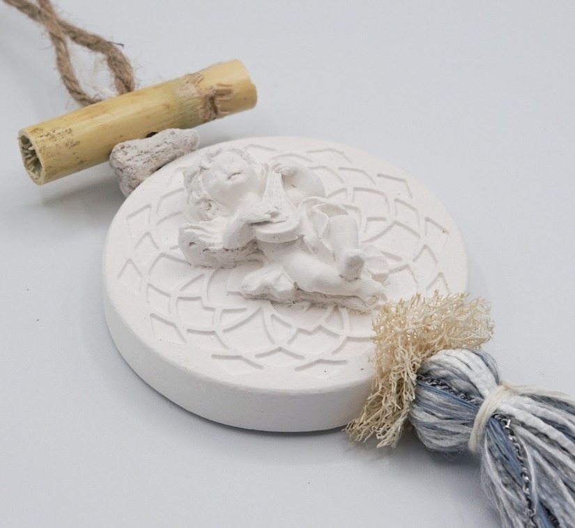 Een bijzondere decoratieve zeepketting met een engelen pleister. De ketting heeft een zacht blauw, grijs en wittige gekleurde pompon.