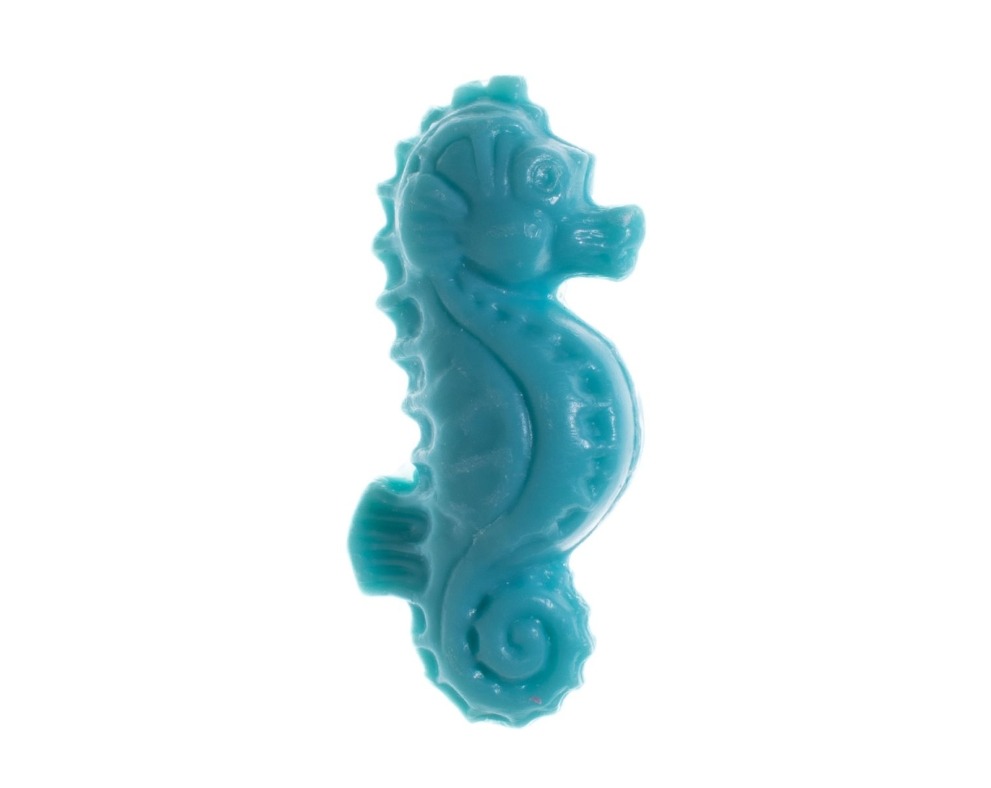 Klein gastenzeepje in de vorm van een zeepaardje. De frisse blauwe kleur geeft een ocean geur af.  Dit zeepje weegt 25 gram.